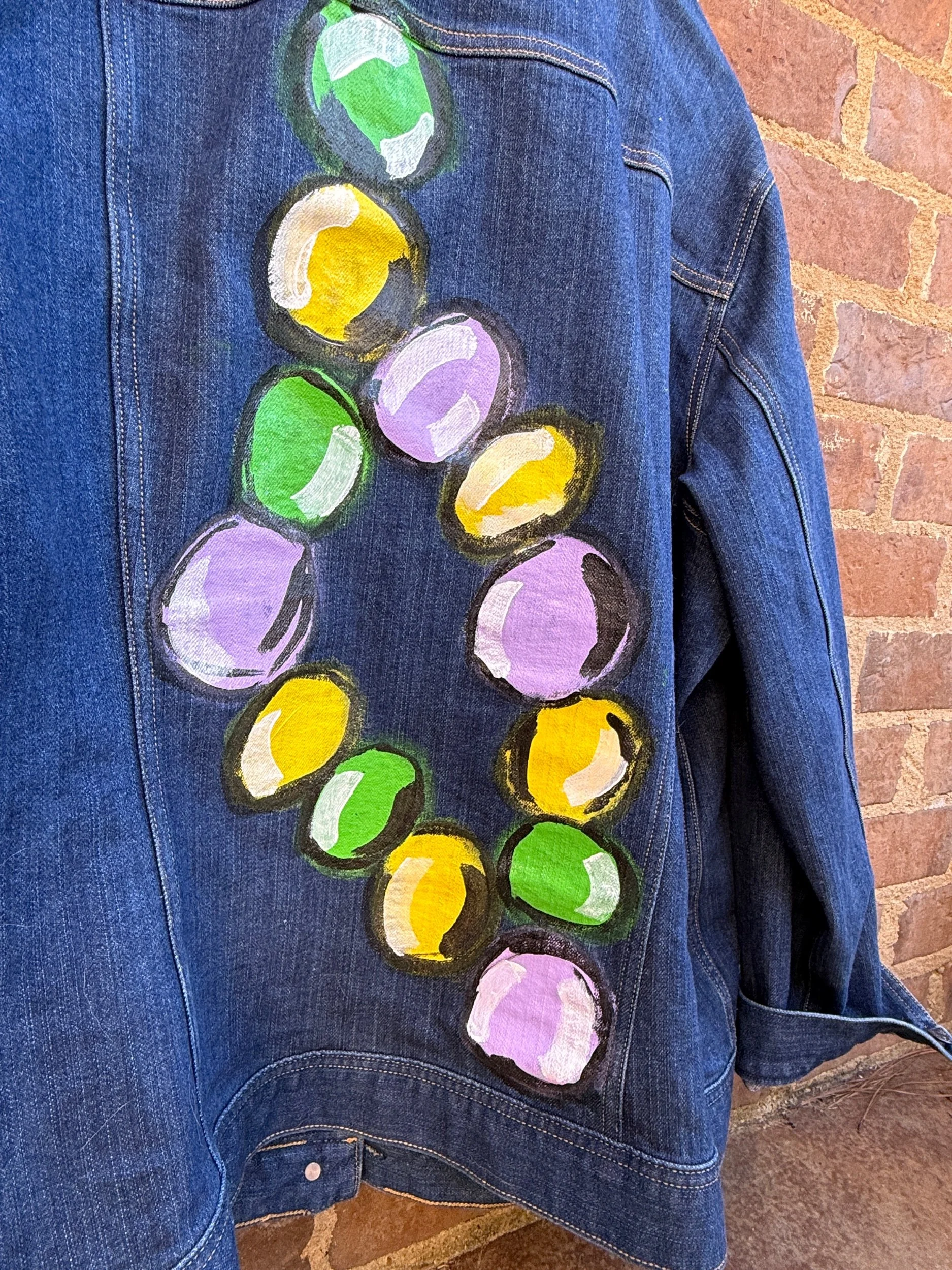 Wearable artwork created in celebration of Mardi Gras, featuring hand-painted elements in traditional purple, green, and gold. Expressive brushstrokes, layered texture, and hand-applied metal studs add movement and edge to classic denim.