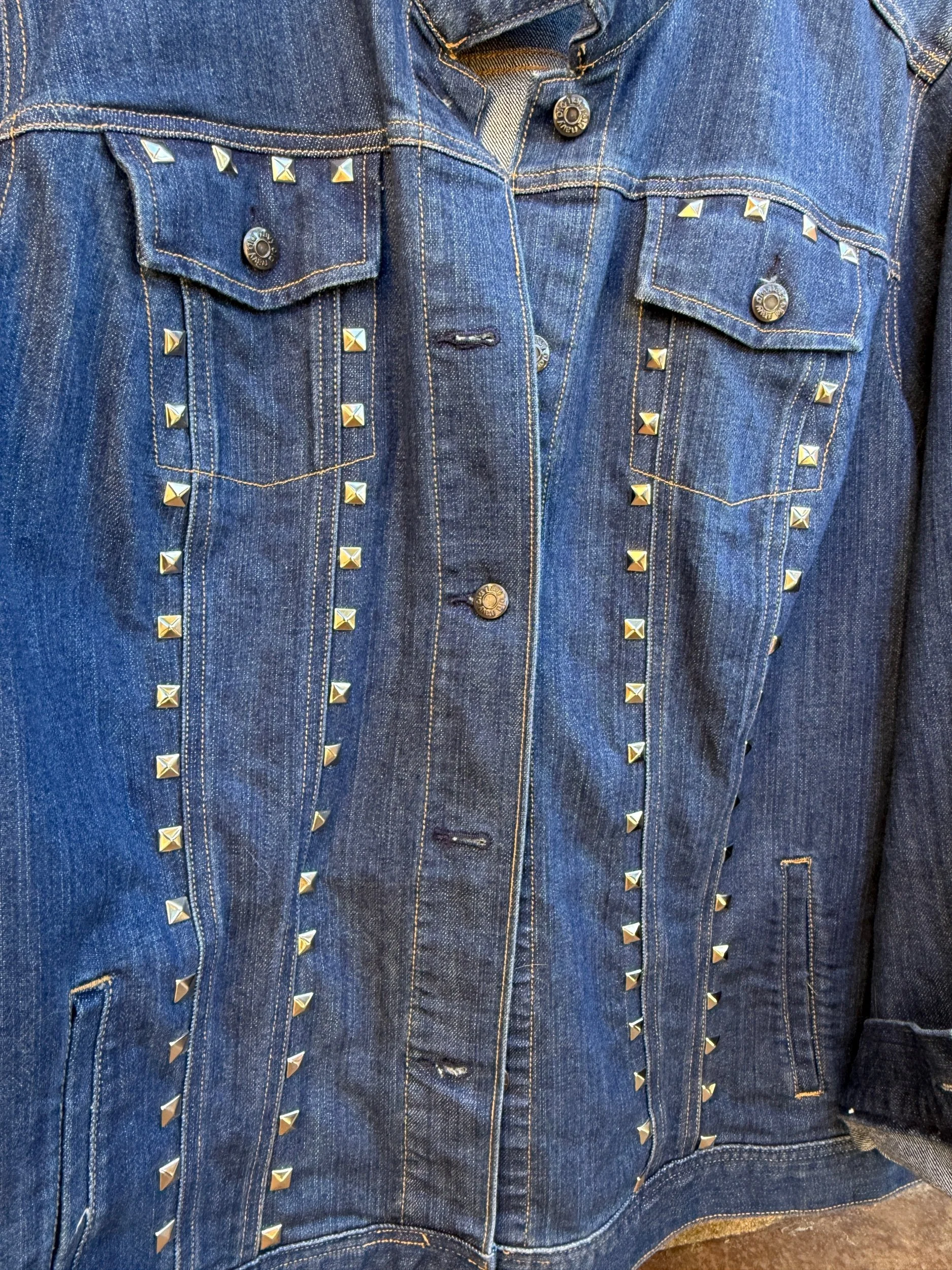 Description: Acrylic on denim with hand-applied metal studs.